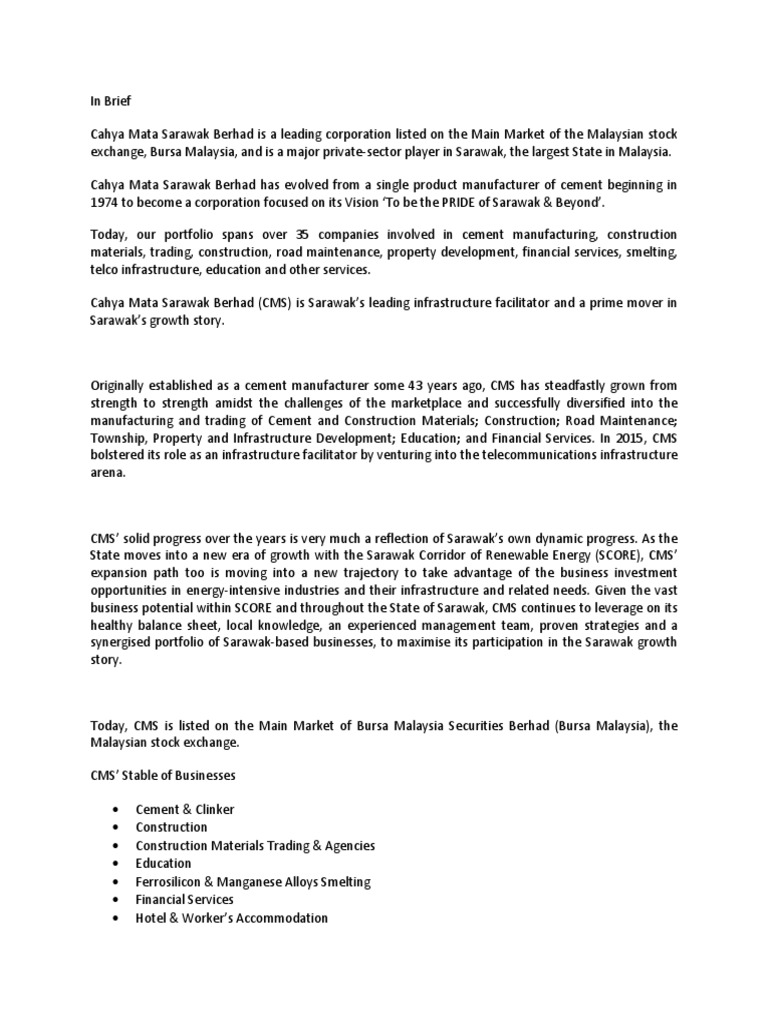 Cahya Mata Sarawak Bhd - Is an investment holding company, which engages in the manufacturing and trading of cement and construction materials, construction, road maintenance, township, and property and infrastructure development.. $cms #cahya mata sarawak bhd cahya mata sarawak (cms mk): Is an investment holding company, which engages in the manufacturing and trading of cement and construction materials, construction, road maintenance, township, and property and infrastructure development. Cahya mata sarawak berhad (cmsb) (myx: Is an investment holding company, which engages in the manufacturing and trading of cement and construction materials, construction, road maintenance, township, and property and infrastructure development. 582 likes · 8 talking about this.