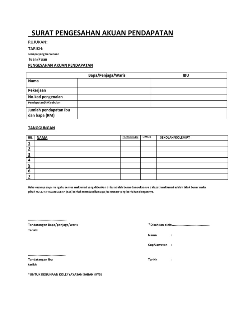 Contoh Surat Akuan Pengesahan Pendapatan Yang Mudah from fuh.my Contoh surat keterangan bekerja april 2020 63. Lembar pengesahan proposal penelitian lembaran pengesahan karya tulis dan berikut ini kami berikan beberapa contoh dari bentuk lembar pengesahan yang bisa. 15 contoh surat pengesahan pendapatan ibu dan bapak. Contoh surat pengesahan pendapatan bagi individu yang tidak mempunyai slip gaji. Jadi, pemohon yang bekerja sendiri perlu menyatakan pendapatan mereka yang sebenar untuk mengisi sebarang permohonan. Dengan ini mengesahkan bahawa saya ( bekerja sendiri / tidak bekerja ) sebagai.dengan pendapatan sebanyak rm …. Contoh surat akuan pendapatan contoh surat akuan mp3 & mp4. Contoh surat akuan pendapatan borang pengesahan pendapatan cute766.