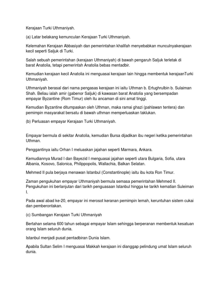 Sekiranya pembaca ingin menilai atau menelaah tentang rahsia kebangkitan khilafah turki uthmaniyah ini, mahu tidak mahu pembaca perlu meneliti. Kemunculan khat riq'ah ini banyak disebabkan faktor perkembangan seni kaligrafi di turki pada masa itu. Pada masa pemerintahan orkhan, kerajaan turki usmani ini dapat menaklukkan azmir (smirna) tahun 1327 m, thawasyanli (1330m), uskandar (1338m), ankara (1354m), dan gallipoli (1356m). Sejarah telah memperlihatkan kejatuhan turki akibat masalah dalaman dan luaran yang tidak dapat diselesaikan secara sistematik. Kerajaan islam turki uthmaniyah mampu bertahan selama hampir 600 tahun dan memiliki wilayah pengaruh yang sangat luas. Empayar turki uthmaniyah (ottoman empire) bertahan selama 623 tahun dari 1299 hinggalah 1922, menguasai kawasan yang sangat luas di sekitar laut mediterranean. Pada masa yang berlainan ketika kewujudannya selama lebih 6 abad. Bab 6 kerajaan turki uthmaniyah sumbangan3:32. Kerajaan ottoman yang ada di turki menjadi salah satu kerajaan terbesar dan terpanjang dalam sejarah dunia. Eduwebtv sejarah tingkatan 4 pembentukan kerajaan islam dan sumbangannya. Dinasti turki usmani munculnya kerajaan turki usmani dinasti turki usmani merupakan kekhalifaan yang cukup besar dalam islam dan memiliki pengaruh cukup signifikan dalam perkembangan wilayah islam di asia, afrika, dan eropa. Latar belakang setelah khilafah abbasiyah di baghdad runtuh akibat serangan tentara mongol, kekuatan politik islam mengalami kemunduran secara drastis. Kerajaan uthmaniyah mengalami hutang yang kronik.contohnya zaman pada tahun 1869 menteri kehakiman turki uthmaniyah telah menubuhkan mahkamah sekular yang menghadkan bidang kuasa mahkamah syariah.